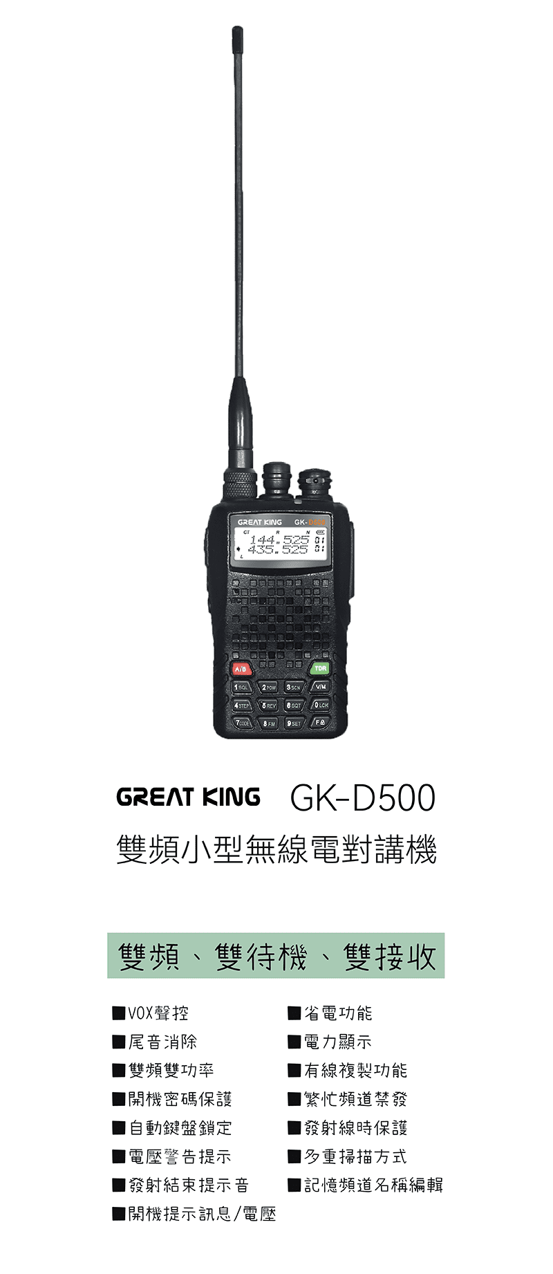 | 頻率範圍 | VHF:144~148MHz UHF:430~440MHz FM收音機:87~107.9MHz |