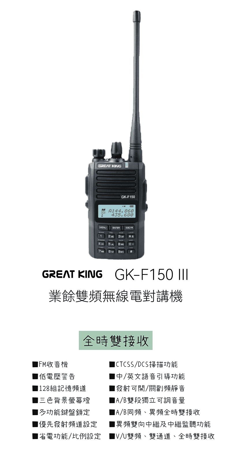 | 頻率範圍 | VHF:144~148MHz UHF:430~440MHz |
